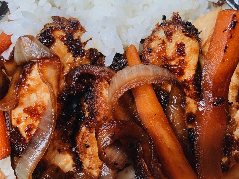 Simmer the carrots and onions with a dash of salt, pepper and soy sauce. Feel free to add other vegetables of your choice (for example asparagus or bell peppers)