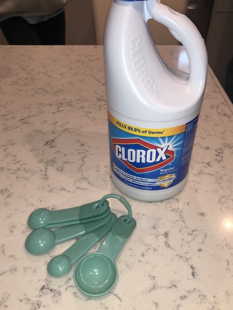 Get 1 cup of hot water and mix in 1/2 tablespoon of clorox bleach. If you choose to use an extract to eliminate some of the bleach smell and make it a bit more pleasant, add about a tablespoon of your scent now as well.