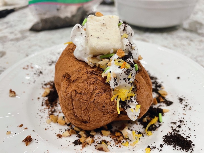 Not actually having any potato in it, an ice cream potato is simply molded ice cream covered in a variety of toppings to visually look like a baked potato.