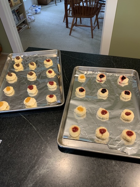 Scoop 1 inch balls of dough onto baking sheet. Using either your thumb or the handle of a wooden spoon (cover with flour if you do, so it doesn't stick), press into the tops of the cookies to form the divot that your jam will go into.