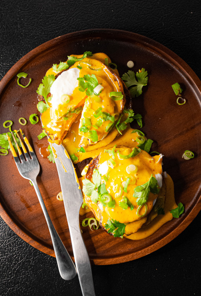 It began with “What if I French-toasted bread, but used khao soi curry as the dipping liquid?” When that turned out to be the bombdotcom, I wanted to make it a whole meal. From there I drew inspiration from a brunch icon, the eggs benedict, and swapped the traditional ingredients with ones you would find in khao soi and other Thai dishes: lime was used as the acid in the hollandaise, cilantro and green onions were used as garnishes, and leftover khao soi curry was swapped in for the butter in the hollandaise. The final product is glorious and likely to shake up your next brunch party.