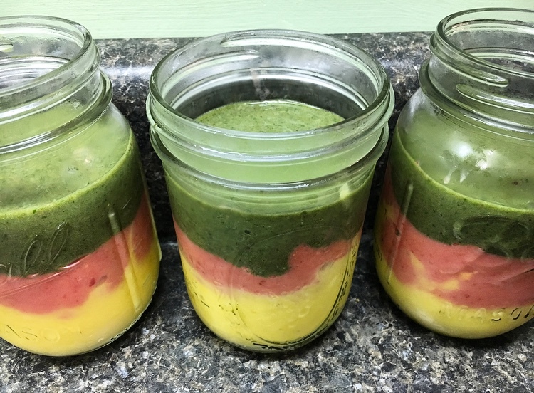 Divide all remaining green smoothie among the three jars or cups and carefully pour on top of the red layer.