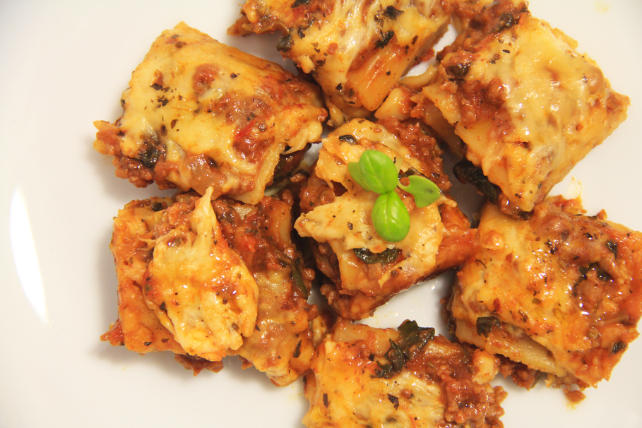 Cut the lasagna into 1-inch square bites. Plate, serve, and enjoy.