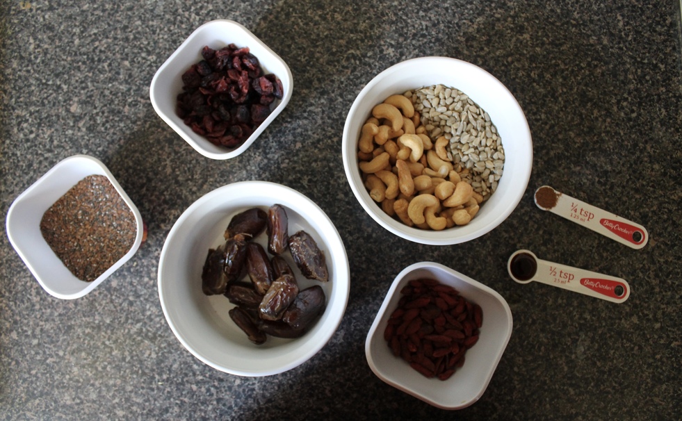 Add the remaining ingredients. I add the chia, flax, and dried fruit in parts so it blends better. The texture should be very sticky. If you notice the mixture is too dry then add 1 tablespoon of water. If the mixture is too wet then add more flax and chia.
