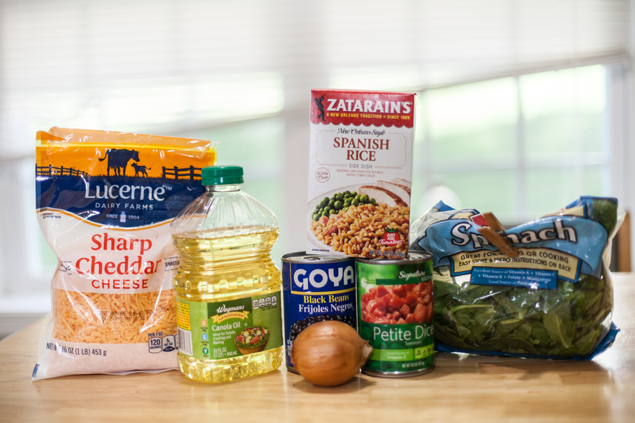 Prepare the Spanish rice according to the directions on the box, bringing the rice mix, diced tomatoes, and water to a boil, then reducing the heat to low. Let the rice steam while you prepare the rest of the ingredients, about 25 minutes.