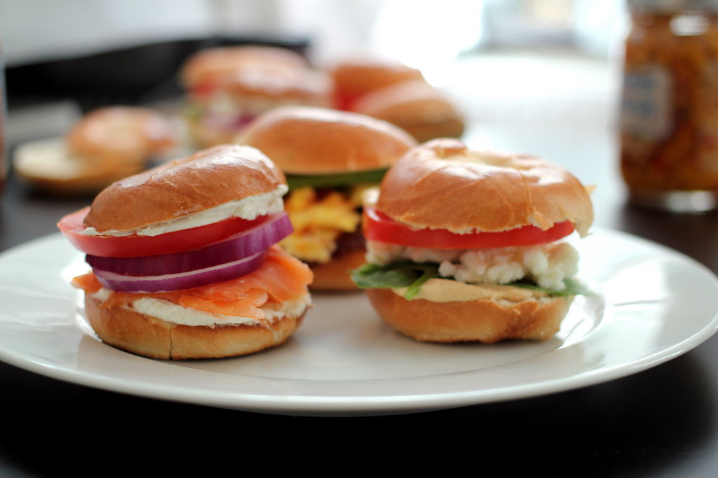 The Desayunito was inspired by Sarah’s Texas roots and her unusually strong love for hot salsa, black beans and cheesy eggs. The Mini Bagelstein reminds us of the instant gratification of breaking the Yom Kippur fast with a bagel piled high with fixings. And Mackenzie just started to like lox, so she wanted to eat them again. Finally, the Richard Simmons slider is our paradoxical attempt to eat fresh, healthy food. Egg whites, tomatoes and spinach are still healthy in between two bagel halves, right?