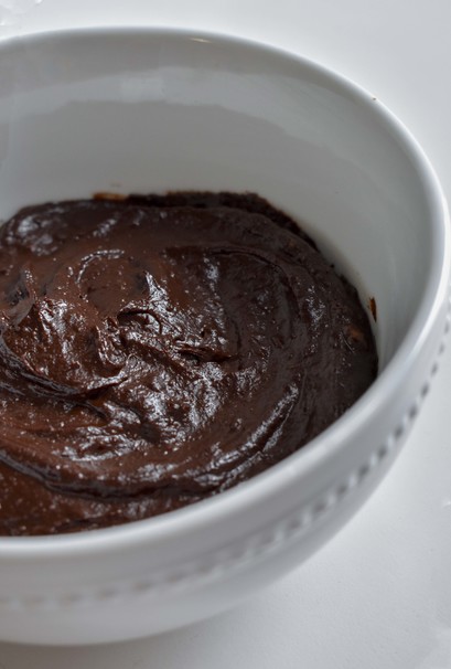 Mash the avocado in a bowl until smooth, then mix in the cacao powder, eggs, coconut sugar, almond butter, baking powder, vanilla and salt.