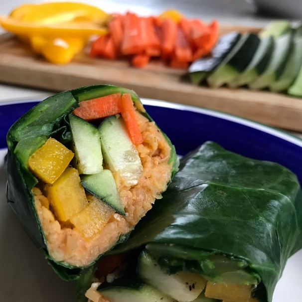 Now comes the fun part: putting it all together! Lay your collard green underside up and fill it with as much filling as you can fit in. I add a little extra drizzle of lime and soy sauce to top it off as well.