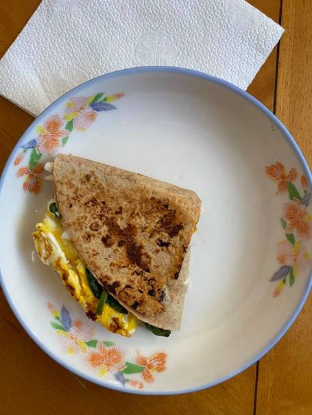 Start folding each quadrant over the others (egg onto spinach, spinach onto ketchup, ketchup onto cheese). Be careful with this step because the food might fall out.