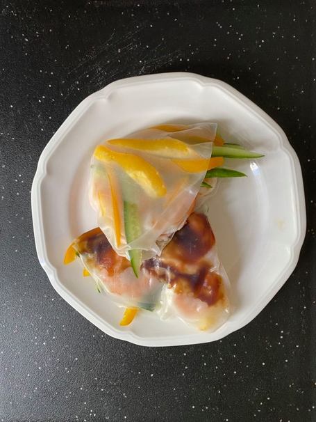 Place the veggies (I used cucumber and bell pepper) in the quadrants, along with the shrimp and hoisin sauce.