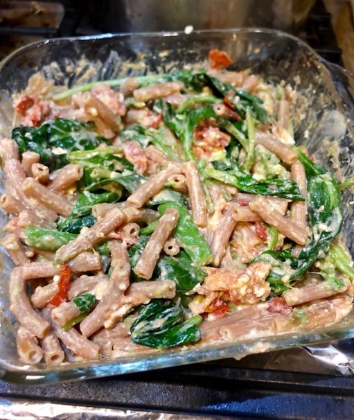 Once the tomatoes, garlic, and feta are ready, mash into a smooth mixture and add pasta and any add ins into the baking tray. I went with spinach and asparagus!