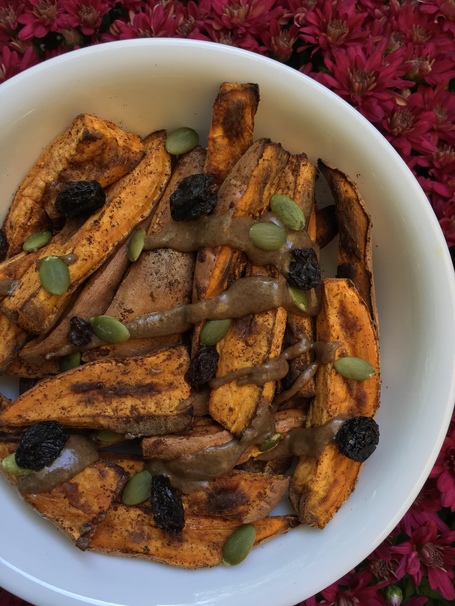 Transfer to the fries to a bowl and top them with nut butter, raisins or dried cranberries, and pumpkin seeds.
