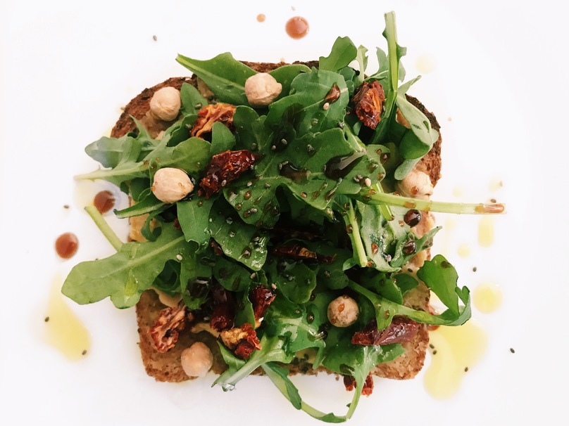 This recipe includes roasted garlic and hummus spread onto crisp toasted sprouted bread, topped with a fresh arugula salad. The arugula is nicely contrasted with the tanginess of sundried tomatoes and the sweetness of the balsamic reduction. The chickpeas and chia seeds provide a variety of texture throughout the toast.