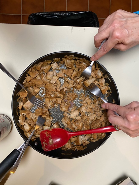 Scoop jackfruit mixture on to a parchment-paper lined baking sheet. Using a fork, shred the jackfruit so it resembles the consistency of pulled pork.