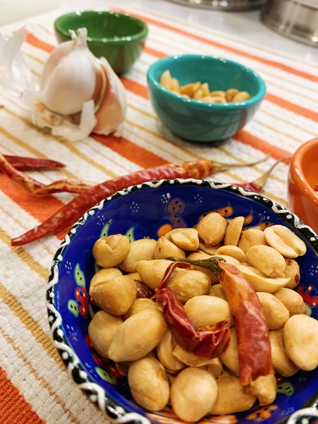 Heat medium sized skillet to medium-low. Add peanuts and dry roast for 15-20 minutes until golden brown. Add the dried whole chili peppers in the last few minutes.