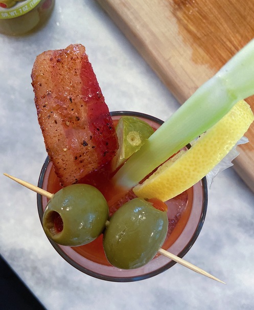Decorate your Bloody Mary! Add the lemon wedges, pickle slices, blue cheese stuffed olives, pickled green beans, and salami if you'd like. The more toppings, the more blessed your year will be!