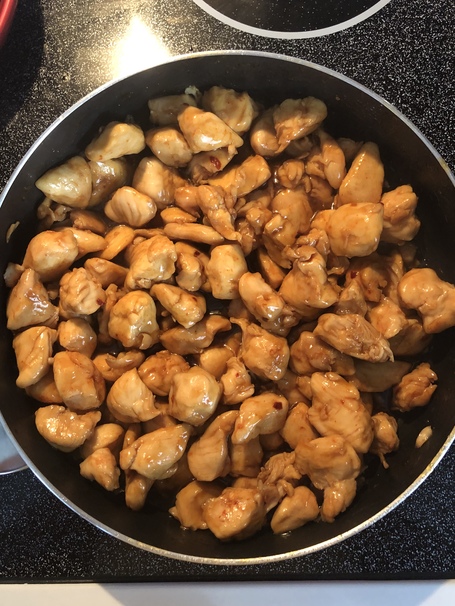 Add the honey, soy sauce, and red pepper sauce mixture to the chicken and stir until the sauce is thick and the chicken is well cooked.