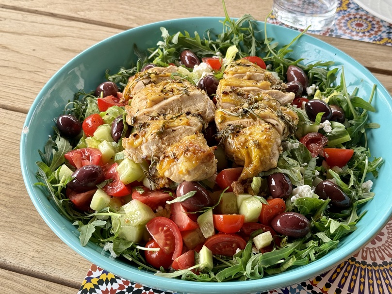 One of the wonderful things about this salad is that it is true to a classic Greek salad but adds other delicious flavors from the Mediterranean, such as tzatziki. An added bonus is that it also contains healthy, protein-packed additions such as grilled chicken.