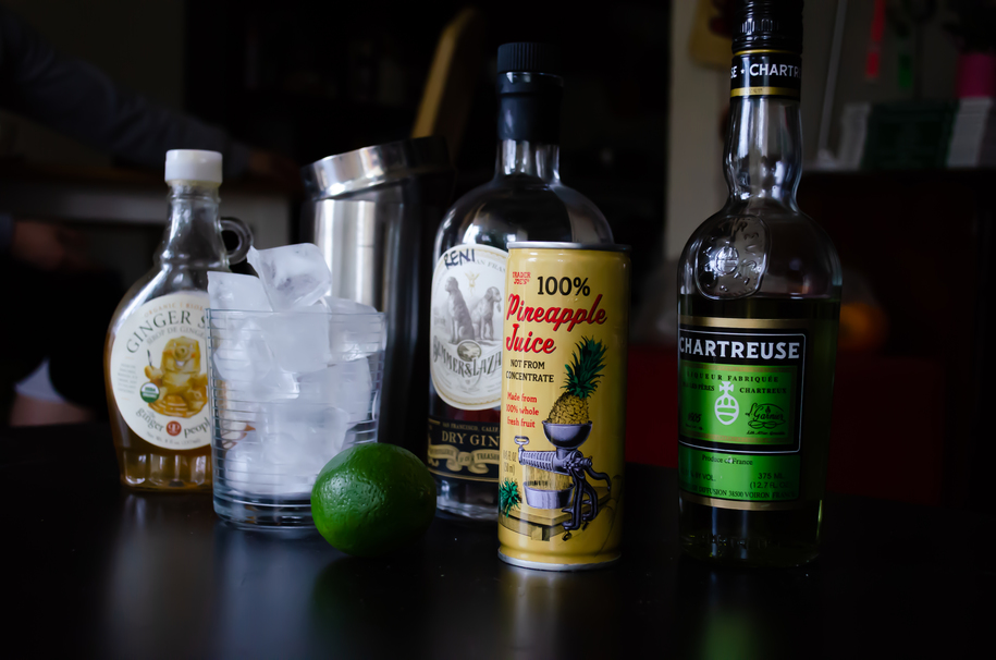 Fill cocktail shaker with ice cubes and then add green chartreuse, gin, pineapple juice, lime juice, and ginger syrup.