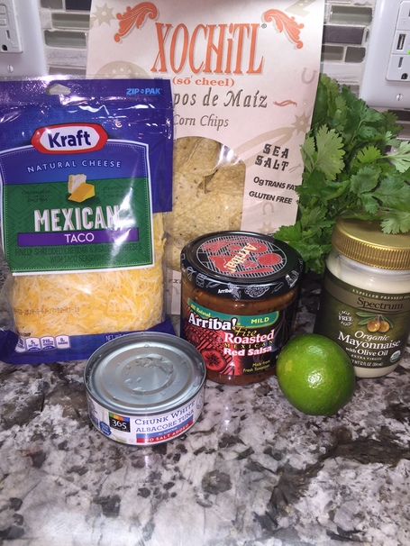 Preheat oven to 400. Combine can of rinsed tuna, mayonnaise, pepper, and lime in a small bowl. Put ingredients on sheet of tinfoil on sheet pan. Place a handful of tortilla chips on a sheet pan. Add tuna salad and cheese on top of chips. Bake for about 10 minutes or until cheese is melted. After it is fully baked, add salsa and cilantro.