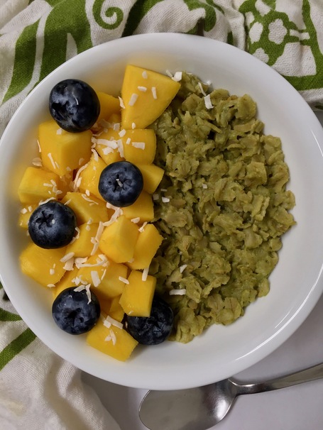 Transfer the oatmeal into a bowl and top with the chopped mango, blueberries, and shredded coconut. Enjoy!