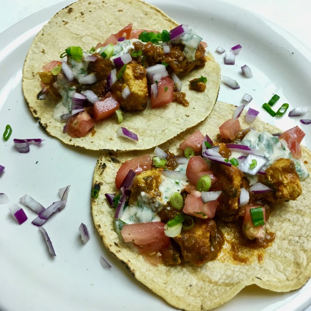 This is the ultimate munchie recipe, blending Mexican and Indian flavors in a spicy and fresh fusion taco. You can interpret this dish to make it as simple or complex as you'd like. I used Trader Joe's Masala Simmer Sauce, which is exceptionally spiced and flavorful, but you can also make chicken tikka masala from scratch.
