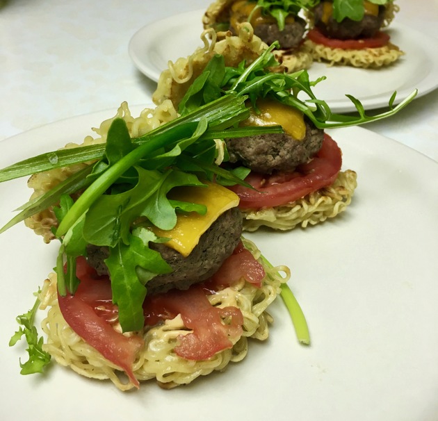Ramen buns: Boil 2 packets of ramen noodles without the seasoning packets (Top Ramen is a classic choice). Once the noodles are cooked, drain, and let cool. Beat 2 eggs, add a dash of salt and pepper and add the room temperature noodles. Coat 4-8 small ramekins with vegetable oil (you'll need to do 2 batches if you only have 4). Put an even handful of the noodle and egg mixture into each bowl, covering each with plastic wrap to keep the buns uniform. Next, you may either stack the ramekins or top each with a small can or jar to flatten the buns. Chill for 10 minutes. Once chilled, pop each out into a frying pan with vegetable oil, and cook to a crispy golden brown on both sides.