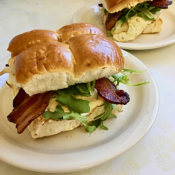 Assembly: Lastly, assemble the sandwich. Spread the mayonnaise on each side of the bun. Then place the fried egg, 2 slices of candied bacon, and a sprinkle of the green onions and arugula.