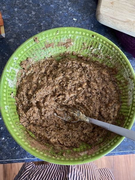 Simply mix ingredients in a bowl and transfer to a baking tin. Bake at 375 degrees for 45 mins or until a toothpick comes out clean.