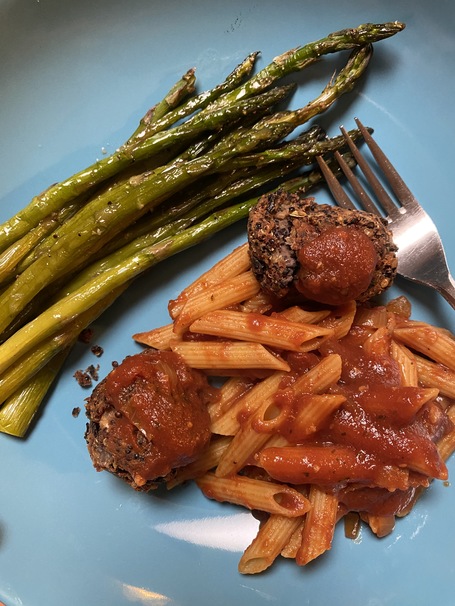I served these meatballs to my parents with pasta and grilled asparagus. Although the red sauce didn't entirely match the flavor profile of the meatballs (I would recommend a cream sauce instead), it provided a hearty option for our plates.