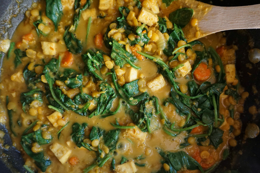 Add most of the vegetable broth and split peas, cover and let simmer until peas are getting soft. Continue to add liquid if necessary. You'll still be adding the coconut milk later so it just depends how thick you like your curry!