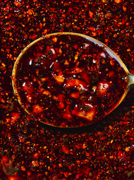 This chili crisp gets down to basics with only three components: oil, chili flakes, and crunch. Unlike Everyday Savory Chili Crisp (page 18), which is packed with complex, garlicky, umami flavors, Very Nutty Chili Crisp lets the texture of chopped nuts costar alongside the spice of chili flakes. It tastes super clean, with a pleasant amount of spice at the end, and the oil smells aromatic and deliciously nutty thanks to a blend of chopped nuts. After testing Lao Gan Ma, one of my favorite chili crisps, in my dessert recipes with unpleasant results, I came up with this chili crisp specifically to complement desserts. It has a little bit of umami from fried chili flakes, so a dollop of this will really elevate the taste of sweets. I honestly swear by using Very Nutty Chili Crisp whenever I make desserts. You can, of course, use this for savory dishes, such as biscuits or noodles.