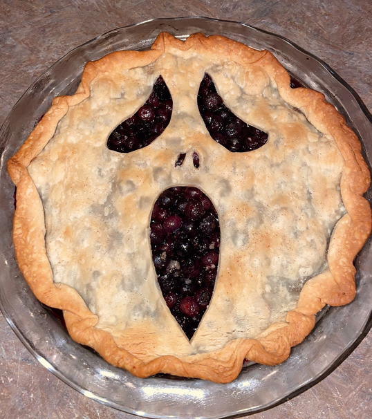 As a huge fan of the Scream franchise and finding joy in the kitchen, it's a no-brainer that I needed to create a pie to resemble the famous Ghostface. I ended up choosing a blueberry pie to give off the impression it's his black cloth material costume, but next time, a cranberry or strawberry pie might be interesting to make to give off a bloody killer pie.
