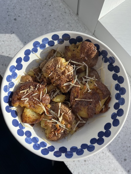 Crispy Smashed Taters is an easy recipe for beginner cooks or those who have limited access to cooking materials - these were made in a communal kitchen on Saint Louis University's campus with just a few kitchen tools and an oven. They're perfect for a hearty snack, a big-game hors-d'œuvre, or as the perfect side dish for your Thanksgiving or Friendsgiving meal!