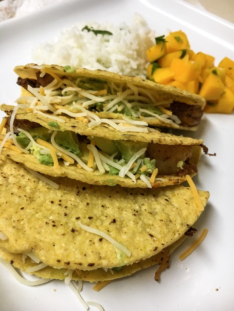 To assemble the tacos, place the seasoned shrimp in the corn tortilla, followed by the chopped avocado and shredded cheese, along with any other toppings you prefer. Finish the plate with the mango salsa and cilantro lime rice.
